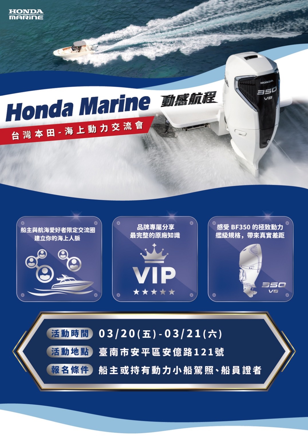Honda Marine將於2026/03/20-21,在臺南安平舉辦「動感航程-海上動力交流會」,邀請船主與航海愛好者一起走上甲板、走向海上,親自感受Honda海上動力的魅力。